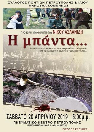 Η προβολή της ταινίας «Η μπάντα» του δημοσιογράφου Νίκου Ασλανίδη, που αναφέρεται στη γενοκτονία των Ελλήνων του Πόντου, θα πραγματοποιηθεί στην Πετρούπολη Αττικής, το Σάββατο 20 Απριλίου 2019.