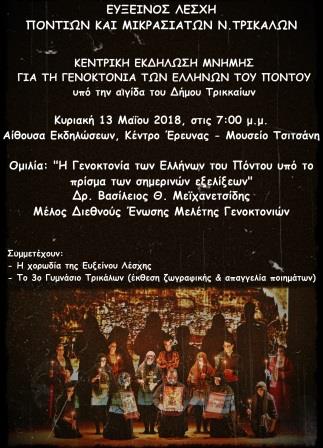 Η Εύξεινος Λέσχη Ποντίων και Μικρασιατών Νομού Τρικάλων, αποτίοντας φόρο τιμής στη Μνήμη των 353.000 νεκρών, πραγματοποιεί την κεντρική της εκδήλωση Μνήμης για τη Γενοκτονία των Ελλήνων του Πόντου, την Κυριακή 13 Μαΐου 2018 στις 7:00 μ.μ., στην αίθουσα εκδηλώσεων του Κέντρου Έρευνας, στο Μουσείο Τσιτσάνη.