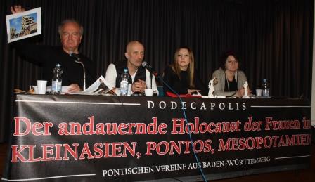 Για τρεις ώρες οι θεατές, Γερμανοί, εκπρόσωποι συλλόγων που ασχολούνται με τα ανθρώπινα δικαιώματα και εθνοτήτων, αλλά και Έλληνες της Γερμανίας, που ζουν στην περιοχή της Στουτγάρδης, στο κρατίδιο της Βάδης Βυρτεμβέργης, άκουγαν με προσοχή και στη συνέχεια έθεσαν ερωτήσεις, στην εκδήλωση με θέμα «Το σε εξέλιξη ολοκαύτωμα των γυναικών στην Μικρά Ασία, στον Πόντο και στην Μεσοποταμία», που διοργάνωσαν οι ποντιακοί σύλλογοι Βάδης Βυρτεμβέργης, με τον διακριτικό αρχαιοελληνικό τίτλο «Δωδεκάπολις», σε διακεκριμένους ομιλητές, το απόγευμα του Σαββάτου 3 Μαρτίου 2018.