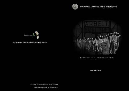 Με το σύνθημα «Η μνήμη σας, ο ανθρωπισμός μας», οι ποντιακοί σύλλογοι της Βάδης Βυδεμβέργης της Γερμανίας, οργάνωσαν και πραγματοποιούν επίσκεψη στο κολαστήριο των Ναζί, στο Νταχάου, προκειμένου να υπενθυμίζουν πως οι απόγονοι των γενοκτονημένων διασωθέντων προσφύγων Ελλήνων του Πόντου, δεν ξεχνούν και τιμούν τα θύματα του ολοκαυτώματος και των γενοκτονιών.