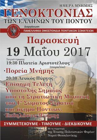 Ο Περιφερειάρχης Κεντρικής Μακεδονίας Απόστολος Τζιτζικώστας και η Αντιπεριφερειάρχης Μητροπολιτικής Ενότητας Θεσσαλονίκης Παρασκευή Πατουλίδου προσκαλούν τους Θεσσαλονικείς και τους κατοίκους της περιφέρειας, να τιμήσουν με την παρουσία τους τις εκδηλώσεις για την Ημέρα Μνήμης της Γενοκτονίας των Ελλήνων του Πόντου που θα πραγματοποιηθούν την Κυριακή 21 Μαΐου 2017.