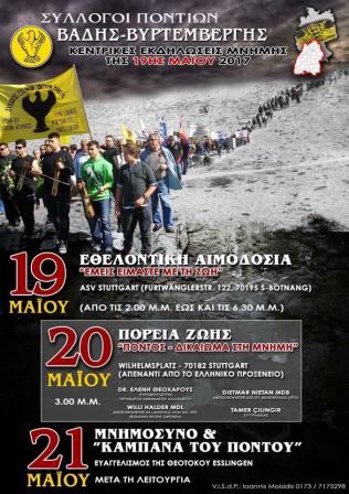 Τριήμερο εκδηλώσεων για να τιμηθούν τα 353.000 θύματα της γενοκτονίας των Ελλήνων του Πόντου πραγματοποιούν οι σύλλογοι Ποντίων της Βάδης Βυρτεμβέργης στη Γερμανία, με ομιλητές που καλύπτουν όλο το φάσμα των ανθρώπων που ασχολήθηκαν με τη γενοκτονία.