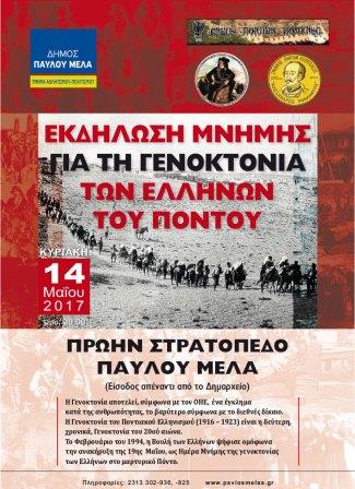 Κοινή ανακοίνωση εξέδωσαν οι τρεις πρόεδροι των ποντιακών συλλόγων του δήμου Παύλου Μελά, οι οποίοι πραγματοποιούν για τρίτη συνεχόμενη φορά κοινή εκδήλωση για να τιμηθεί η μνήμη της γενοκτονίας την Κυριακή 14 Μαΐου 2017, στο χώρο του πρώην στρατοπέδου και εκφράζουν την έκπληξή τους ότι ηλεκτρονική ιστοσελίδα ότι παρερμηνεύεται αυτή η δράση, και καλούν τον κόσμο να πάρει μέρος στην εκδήλωση της Π.Ο.Ε. στην πλατεία Αγίας Σοφίας και στη πορεία προς το Τούρκικο προξενείο.
