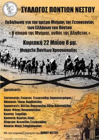 Εκατοντάδες κάτοικοι της Θεσσαλονίκης επισκέπτονται καθημερινά από την Δευτέρα 16 Μαΐου 2016 το ενημερωτικό περίπτερο της Συντονιστικής Επιτροπής Νεολαίας της Παμποντιακής Ομοσπονδίας Ελλάδος στην πλατεία Αριστοτέλους, στη συμβολή με την οδό Μητροπόλεως, όπου γίνεται ενημέρωση για τη γενοκτονία που διέπραξαν οι Οθωμανοί, οι Νεότουρκοι και οι Κεμαλικοί σε βάρος των Ελλήνων του Πόντου.