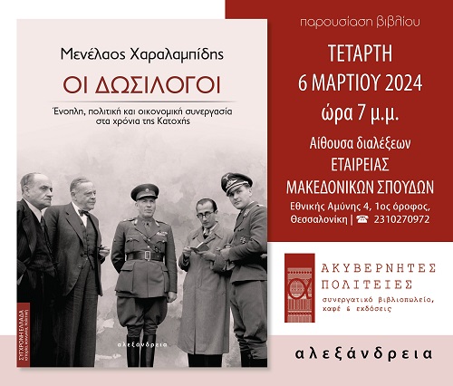 Το βιβλίο του Μενέλαου Χαραλαμπίδη ΟΙ ΔΩΣΙΛΟΓΟΙ, Ένοπλη πολιτική και οικονομική συνεργασία στα χρόνια της Κατοχής, θα πραγματοποιηθεί στη Θεσσαλονίκη το βράδυ της Τετάρτης 6 Μαρτίου 2024, στην Εταιρία Μακεδονικών Σπουδών.