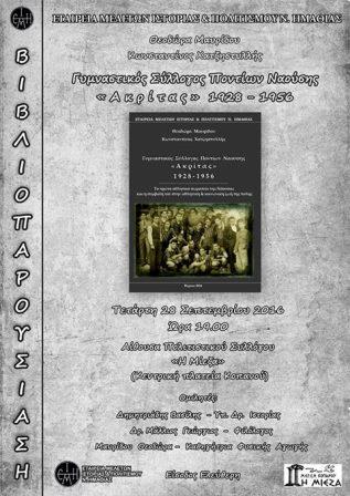 Την παρουσίαση του βιβλίου Θεοδώρας Μαυρίδου και Κωνσταντίνου Χατζηστυλλή με τίτλο«Γυμναστικός Σύλλογος Ποντίων Ναούσης «Ακρίτας» 1928 – 1956», που εντάσσεται στο πλαίσιο της Στ’ Εβδομάδας Τοπικής Ιστορίας και Πολιτισμού, διοργανώνουν ο πολιτιστικός σύλλογος Κοπανού «Η ΜΙΕΖΑ» και η Εταιρεία Μελετών Ιστορίας και Πολιτισμού νομού Ημαθίας.