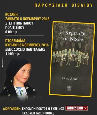 Συγκεκριμένα η εκπομπή Πόντος ο Εύξεινος τηλεόραση FLASH TV και οι εκδόσεις IASON BOOKS διοργανώνουν την παρουσίαση του νέου βιβλίου του Ομέρ Ασάν «Η Κεμεντζέ του Νίκου», το Σάββατο 5 Νοεμβρίου 2016, στις 6 το βράδυ στην Στέγη Ποντιακού Πολιτισμού της Ευξείνου Λέσχης Κοζάνης.