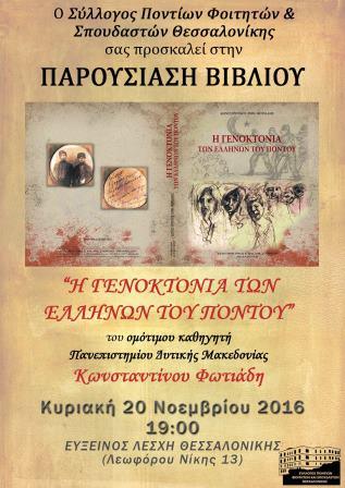 Η παρουσίαση του βιβλίου του ομότιμου καθηγητή του πανεπιστημίου Δυτικής Μακεδονίας Κώστα Φωτιάδη, «η Γενοκτονία των Ελλήνων του Πόντου», θα γίνει με πρωτοβουλία του συλλόγου Ποντίων Φοιτητών και Σπουδαστών Θεσσαλονίκης, στο εντεκτήριο της Ευξείνου Λέσχης Θεσσαλονίκης.