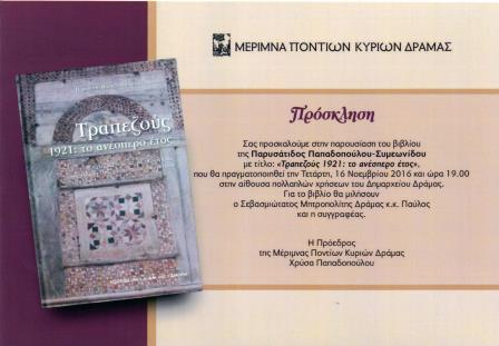 Το βιβλίο της Παρυσάτιδος Παπαδοπούλου – Συμεωνίδου «Τραπεζούς 1921: το ανέσπερο έτος», θα παρουσιαστεί από την Μέριμνα Ποντίων Κυριών Δράμας, την Τετάρτη 16 Νοεμβρίου 2016, στις 7 το βράδυ στην αίθουσα πολλαπλών χρήσεων του δημαρχείου Δράμας.