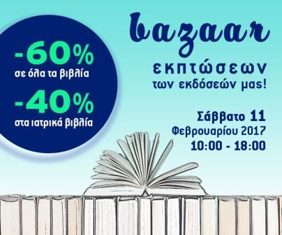 Σύμφωνα με ανακοίνωση του εκδοτικού οίκου University Studio Press το μπαζάρ βιβλίων θα πραγματοποιηθεί το Σάββατο 11 Φεβρουαρίου 2017, από τις 10 το πρωί μέχρι τις 18.00 στα βιβλιοπωλεία του εκδοτικού οίκου και περιλαμβάνει εκπτώσεις των εκδόσεών του, 60% σε όλα τα βιβλία και 40% σε όλα τα ιατρικά βιβλία.