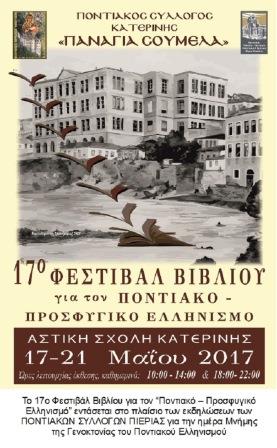 Πενθήμερο φεστιβάλ ποντιακού βιβλίου, αφιέρωμα στον ποντιακό και προσφυγικό ελληνισμό, διοργανώνει ο ποντιακός σύλλογος Κατερίνης «Παναγία Σουμελά», από την Τετάρτη 17 Μαΐου έως την Κυριακή 21 Μαΐου 2017.