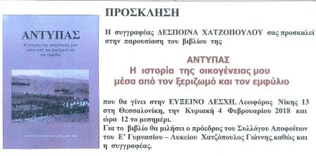 Το βιβλίο της συγγραφέως Δέσποινας Χατζοπούλου, «ΑΝΤΥΠΑΣ. Η ιστορία της οικογένειάς μου, μέσα από τον ξεριζωμό και τον εμφύλιο», θα παρουσιαστεί σε ειδική εκδήλωση που θα γίνει στην Εύξεινο Λέσχη Θεσσαλονίκης.