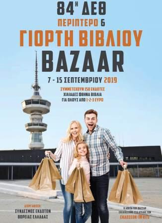 Την «10η Γιορτή Βιβλίου - Bazaar» στην 84η Διεθνή Έκθεση Θεσσαλονίκης, διοργανώνει ο Σύνδεσμος Εκδοτών Βόρειας Ελλάδας, στο Περίπτερο 6, από τις 7 έως τις 15 Σεπτεμβρίου 2019, όσο δηλαδή διαρκεί και η Γενική Έκθεση στη ΔΕΘ.