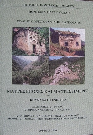 Το Διοικητικό Συμβούλιο της Επιτροπής Ποντιακών Μελετών ανακοινώνει την κυκλοφορία του νέου βιβλίου της ειδικής έκδοσης Ποντιακά Παράφυλλα (αρ. 3): Στάθης Κ. Χριστοφορίδης - Σάρπογλης, «Κουνάκα, η γενέτειρα. Αναμνήσεις - Θρύλοι. Ιστορικά ανέκδοτα - Παραμύθια», γραμμένο στο ιδίωμα της Άνω Ματσούκας του Πόντου, με απόδοση στη νεοελληνική από τον γιο του συγγραφέα, Χριστόφορο Χριστοφορίδη.