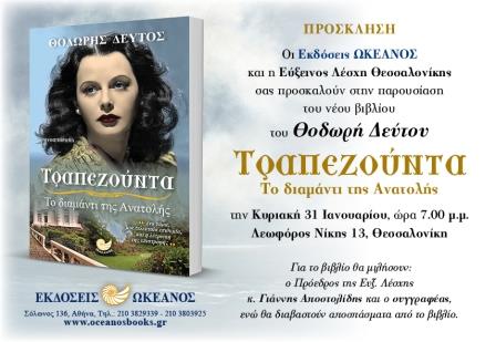 Το νέο βιβλίο του Θοδωρή Δεύτου, «Τραπεζούντα, το διαμάντι της Ανατολής», των εκδόσεων ΩΚΕΑΝΟΣ, θα παρουσιαστεί την Κυριακή 31 Ιανουαρίου 2016, στις 7 το βράδυ, στην αίθουσα εκδηλώσεων της Ευξείνου Λέσχης Θεσσαλονίκης (Λεωφ. Νίκης 13, 2ος όροφος).