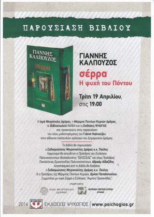 Η παρουσίαση του μυθιστορήματος του συγγραφέα Γιάννη Καλπούζου, «σέρρα… η ψυχή του Πόντου, των εκδόσεων ΨΥΧΟΓΙΟΣ, θα πραγματοποιηθεί την Τρίτη 19 Απριλίου 2016 στις 19.00 το βράδυ στην αίθουσα πολλαπλών χρήσεων του δημαρχείου Δράμας.