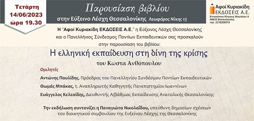 Το βιβλίο του Κώστα Ανθόπουλου “Η ελληνική εκπαίδευση στη δύνη της κρίσης” των εκδόσεων “Αφοί Κυριακίδης ΕΚΔΟΣΕΙΣ Α.Ε.”, θα παρουσιαστεί, με πρωτοβουλία της Ευξείνου Λέσχης Θεσσαλονίκης και του Πανελληνίου Συνδέσμου Ποντίων Εκπαιδευτικών, την Τετάρτη 14 Ιουνίου 2023, στις 7.30 το βράδυ, στο εντευκτήριο της Λέσχης, στην οδό Λεωφόρου Νίκης 13, (2ος όροφος).