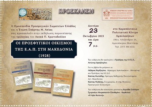 Η παρουσίαση των τριών βιβλίων του Λουκά Π. Χριστοδούλου, «Οι προσφυγικοί οικισμοί της ΕΑΠ στη Μακεδονία (1928)», θα πραγματοποιηθεί την Δευτέρα 23 Οκτωβρίου 2023, στο Καραπάντσειο Πολιτιστικό Κέντρο Αμπελοκήπων (Μεγ. Αλεξάνδρου 24), την Δευτέρα 23 Οκτωβρίου 2023, στις 7 το βράδυ.