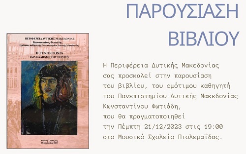 Η εκδήλωση παρουσίασης του βιβλίου του Κώστα Φωτιάδη, «Η Γενοκτονία των Ελλήνων του Πόντου», θα παρουσιαστεί σε ειδική εκδήλωση στην πόλη της Πτολεμαΐδας την Πέμπτη 21 Δεκεμβρίου 2023, και ώρα 19.00, στο Μουσικό Σχολείο Πτολεμαΐδας.