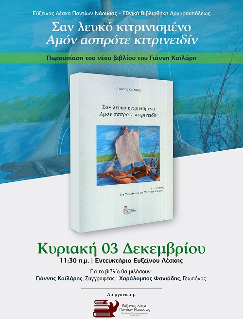 Το νέο βιβλίο του Δρ. Γιάννη Καϊλάρη, το πεζογράφημα «Σαν λευκό κιτρινισμένο – Άμον ασπρότε κιτρινειδίν», στη Νεελληνική γλώσσα και στην Ποντιακή διάλεκτο, κυκλοφορεί στα βιβλιοπωλεία, ενώ η παρουσίασή του θα γίνει την Κυριακή 3 Δεκεμβρίου 2023, στο εντευκτήριο της Ευξείνου Λέσχης Ποντίων Νάουσας.