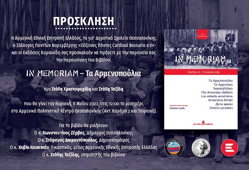 Το βιβλίο του Στάθη Χριστοφορίδη ΙΝ ΜΕΜΟΡΙΑΜ – Τα Αρμενοπούλια, σε επιμέλεια του Στάθη Ταξίδη, θα παρουσιαστεί την Κυριακή, 8 Μαΐου 2022, στις 12 το μεσημέρι, από την Αρμενική Εθνική Επιτροπή Ελλάδος, το 50ο Δημοτικό Σχολείο Θεσσαλονίκης και το Σύλλογο Ποντίων Νυρεμβέργης, στο Αρμενικό Πολιτιστικό Κέντρο Θεσσαλονίκης (Αντωνίου Καμάρα 2 και Τσιμισκή, απέναντι από τη ΧΑΝΘ).
