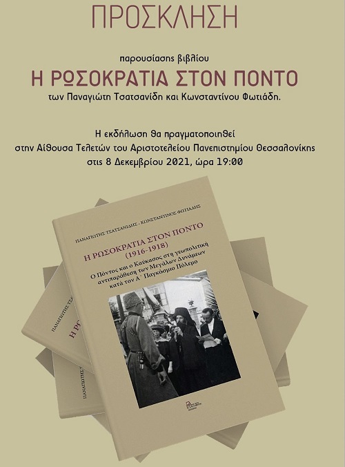Το νέο βιβλίο των Παναγιώτη Τσατσανίδη και Κωνσταντίνου Φωτιάδη, «Η Ρωσοκρατία στον Πόντο», του Εκδοτικού Οίκου Κ. και Μ. Σταμούλη, θα παρουσιαστεί σε ειδική εκδήλωση στην Αίθουσα Τελετών του Αριστοτελείου Πανεπιστημίου Θεσσαλονίκης, την Τετάρτη 8 Δεκεμβρίου 2021, και ώρα 19.00.