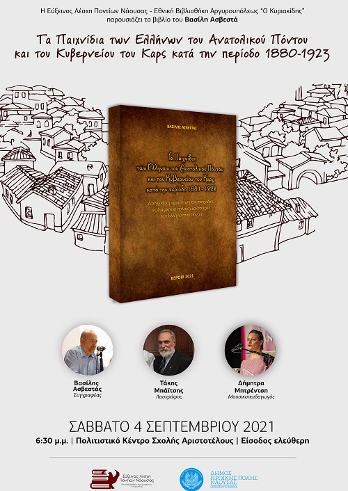 Η Εύξεινος Λέσχη Ποντίων Νάουσας - Εθνική Βιβλιοθήκη Αργυρουπόλεως, διοργανώνει και σας προσκαλεί στην εκδήλωση παρουσίασης του νέου βιβλίου του Βασίλη Ασβεστά, με τίτλο: «Τα Παιχνίδια των Ελλήνων του Ανατολικού Πόντου και του Κυβερνείου του Καρς κατά την περίοδο 1880 - 1923».