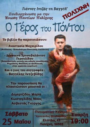 Το βιβλίο «ο γέρος του Πόντου», θα παρουσιαστεί το Σάββατο 25 Μαΐου 2019, στις 7 το βράδυ, από την Ένωση Ποντίων Πολίχνης, στο πνευματικό κέντρο «Χρύσανθος Θεοδωρίδης», Ελπίδος 43.
