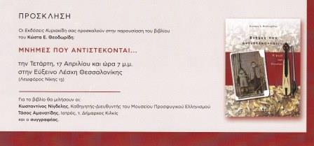 Το βιβλίο του Κώστα Θεοδωρίδη, «Μνήμες που αντιστέκονται… Η ψυχή των Ποντίων», θα παρουσιαστεί την Τετάρτη 17 Απριλίου 2019, στις 7 το βράδυ, στην Εύξεινο Λέσχη Θεσσαλονίκης (Λεωφόρος Νίκης 13), από τις Εκδόσεις Κυριακίδη.