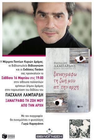 Η Μέριμνα Ποντίων Κυριών Δράμας, το Βιβλιοπωλείο ΒΙΒΛΙΟΓΝΩΣΗ και οι Εκδόσεις Πατάκη παρουσιάζουν το Σάββατο 16 Μαρτίου 2019 στις 7 το βράδυ στην αίθουσα πολλαπλών χρήσεων του Δήμου Δράμας στην παρουσίαση του νέου βιβλίου του Πασχάλη Λαμπαρδή, «ΞΑΝΑΓΡΑΦΩ ΤΗΝ ΖΩΗ ΜΟΥ ΑΠΟ ΤΗΝ ΑΡΧΗ». Με τον συγγραφέα θα συνομιλήσει και η ψυχολόγος Γωγώ Καραγιάννη.