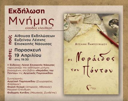 Την παρουσίαση του βιβλίου της Αγγελικής Παμπουκίδου, «Οι Νεράϊδες του Πόντου», διοργανώνει η Εύξεινος Λέσχη Επισκοπής Νάουσας στα πλαίσια των δράσεων της για τα 100 χρόνια μνήμης της Γενοκτονίας των Ποντίων.