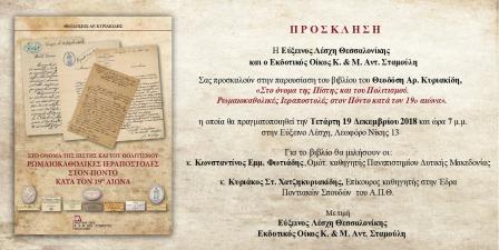 Το βιβλίο του Θεοδόση Αρ. Κυριακίδη «Στο όνομα της πίστης και του πολιτισμού. Ρωμαιοκαθολικές ιεραποστολές στον Πόντο κατά τον 19ο αιώνα», θα παρουσιαστεί στην Εύξεινο Λέσχη Θεσσαλονίκης, σε συνεργασία με τον εκδοτικό οίκο Κ. και Μ. Αντώνη Σταμούλη, την Τετάρτη 19 Δεκεμβρίου 2018, στις 7 το βράδυ, στο εντευκτήριο της Λέσχης, στην οδό Λεωφ. Νίκης 13, 2ος όροφος.