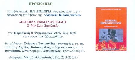 Το βιβλίο της Δέσποινας Κ. Χατζοπούλου, "Δέσποινα Εμμανουηλίδου. Ο Μεγάλος Ξεριζωμός», θα πραγματοποιηθεί την Παρασκευή 8 Φεβρουαρίου 2018, στη Θεσσαλονίκη και συγκεκριμένα στο βιβλιοπωλείο ΠΡΩΤΟΠΟΡΙΑ, που βρίσκεται στην παραλιακή λεωφόρο της προσφυγομάνας της πρωτεύουσας της Μακεδονίας, εκεί όπου ήρθε και εγκαταστάθηκε η μεγάλη πλειοψηφία των προσφύγων και των ανταλλαγέντων της Μικρασιατικής Καταστροφής.