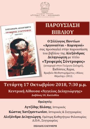 Το μυθιστόρημα της ομότιμης καθηγήτριας του Αριστοτελείου Πανεπιστημίου Θεσσαλονίκης, Αλεξάνδρας Δεληγιώργη «Τρυφερός Σύντροφος», όπου αναφέρεται στον Γεώργιο Σκληρό – Κωνσταντινίδη, τον πρώτο Έλληνα σοσιαλιστή με καταγωγή από τον Πόντο, διοργανώνει ο σύλλογος Ποντίων «Αργοναύται – Κομνηνοί» και προσκαλεί τα μέλη και τους φίλους του συλλόγου, αλλά και όλους όσους ενδιαφέρονται να μάθουν για αυτήν την μεγάλη προσωπικότητα, να παρευρεθούν στην εκδήλωση που πραγματοποιείται την Τετάρτη 15 Οκτωβρίου 2018.