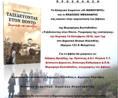 Το βιβλίο της Μυροφόρας Ε. Ευσταθιάδου, «Ταξιδεύοντας στον Πόντο. Τουρισμός της νοσταλγίας», θα παρουσιαστεί την Κυριακή 14 Οκτωβρίου 2018, στην Καλλιθέα στην Αττική.