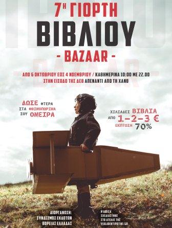 Το μεγαλύτερο Παζάρι Βιβλίου των εκδοτών και με πολλούς νέους τίτλους θα λειτουργεί από τις 6 Οκτωβρίου και έως τις 4 Νοεμβρίου στην Κεντρική Πύλη της Διεθνούς Εκθέσεως Θεσσαλονίκης (ΔΕΘ), (είσοδος ΧΑΝΘ).