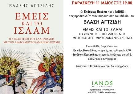 Η παρουσίαση του βιβλίου του Βλάση Αγτζίδη, «Εμείς και το Ισλάμ. Η συνάντηση του ελληνισμού με τον Αραβο – μουσουλμανικό κόσμο», θα πραγματοποιηθεί την Παρασκευή 11 Μαΐου 2018, στις 7 το βράδυ, από τις εκδόσεις Πατάκη και τον ΙΑΝΟ, στη Θεσσαλονίκη.