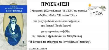 Την παρουσίαση του βιβλίου της Ροζαλίας Γαβριηλίδου και του Θεοφάνη Μαλκίδη «Η βιογραφία του οπλαρχηγού του Πόντου Παύλου Τσαουσίδη», διοργανώνει ο Μορφωτικός Σύλλογος Κοπανού «Η ΜΙΕΖΑ» στην αίθουσα του συλλόγου το Σάββατο 5 Μαΐου 2018, στις 7:30 το βράδυ, στην Κεντρική Πλατεία Κοπανού Δήμου Νάουσας.