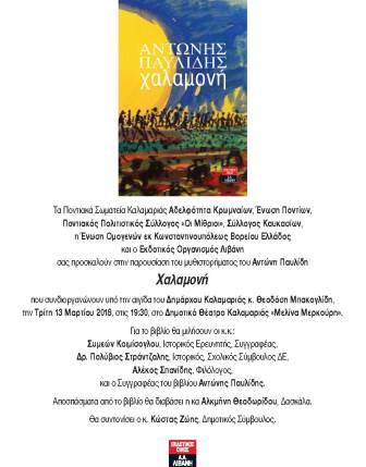 Το βιβλίο – μυθιστόρημα του Αντώνη Παυλίδη «Χαλαμονή» θα παρουσιαστεί το βράδυ της Τρίτης 13 Μαρτίου 2018, στην Καλαμαριά της Θεσσαλονίκης, σε μια εκδήλωση που συνδιοργανώνουν οι ποντιακοί σύλλογοι, με τους Κωνσταντινουπολίτες και το δήμο.