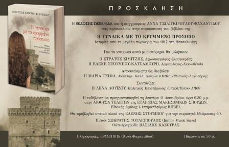 Το βιβλίο της Άννας Τσιλιγκίρογλου – Φαχαντίδου, «η γυναίκα με το κρυμμένο πρόσωπο», που αναφέρεται σε ιστορίες από τη μεγάλη πυρκαγιά του 1917 στη Θεσσαλονίκη, θα παρουσιαστεί την Δευτέρα 11 Δεκεμβρίου 2017, στη Θεσσαλονίκη.