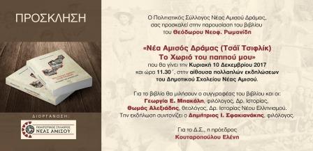 Η παρουσίαση του βιβλίου του Θεόδωρου Νεοφ. Ρωμανίδη «Νέα Αμισός Δράμας (Τσάϊ τσιφλίκ)-το χωριό του παππού μου», θα παρουσιαστεί την Κυριακή 10 Δεκεμβρίου 2017 και ώρα 11.30 στην αίθουσα του Δημοτικού Σχολείου Νέας Αμισού Δράμας, την οποία διοργανώνει ο πολιτιστικός σύλλογος Νέας Αμισού.