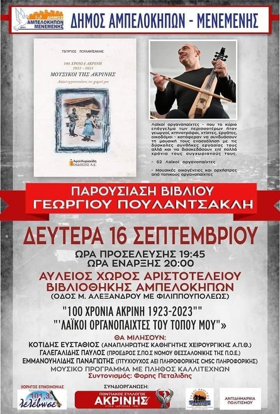 Το νέο βιβλίο του μουσικού Γιώργου Πουλαντσακλή «100 χρόνια Ακρινή 1923 – 2023. Μουσικοί της Ακρινής. Λαϊκοί οργανοπαίχτες του χωριού μου», που εξέδωσαν οι Αδελφοί Κυριακίδη ΕΚΔΟΣΕΙΣ Α.Ε., θα παρουσιαστεί στους Αμπελόκηπους Θεσσαλονίκης, το βράδυ της Δευτέρας 16 Σεπτεμβρίου 2024, στον Αύλειο χώρο της Αριστοτελείου Βιβλιοθήκης Αμπελοκήπων.