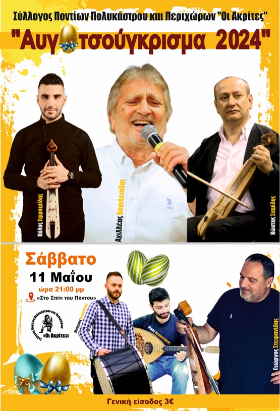 Το πατροπαράδοτο έθιμο των αυγοτσουγκρισμάτων, αλλά με πλούσιο καλλιτεχνικό πρόγραμμα με ποντιακά τραγούδια, με τους καλλιτέχνες Αχιλλέα Βασιλειάδη, Κώστα Σιαμίδη, Γιώργο Στεφανίδη και Πόλυ Εφραιμίδη, διοργανώνει ο Σύλλογος Ποντίων Πολυκάστρου και Περιχώρων «Οι Ακρίτες», το βράδυ του Σαββάτου 11 Μαΐου 2024 στον αύλειο χώρο του Συλλόγου στο «Σπίτι του Πόντου», με γενική είσοδο 3 ευρώ.