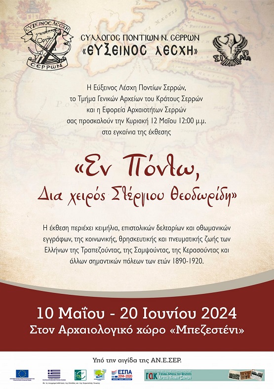 Έκθεση κειμηλίων, επιστολικών δελταρίων και οθωμανικών εγγράφων για τη ζωή στον Εύξεινο Πόντο, τη χρονική περίοδο 1890 – 1920, του αείμνηστου Στέργιου Θεοδωρίδη, πραγματοποιείται στην πόλη των Σερρών, με πρωτοβουλία φορέων της πόλης, και τα εγκαίνιά της θα γίνουν την Κυριακή 12 Μαΐου 2024, στις 12 το μεσημέρι.