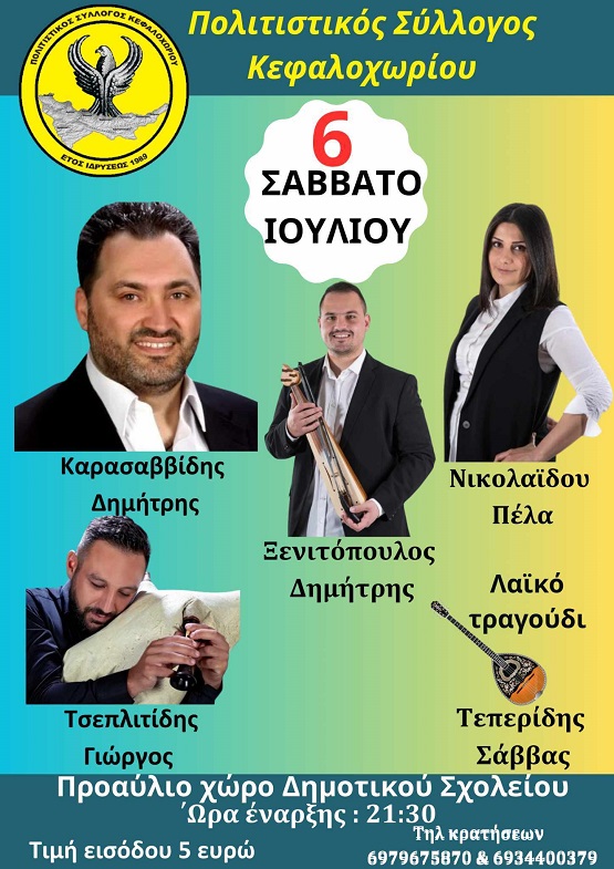 Ο Καλοκαιρινός Χορός θα πραγματοποιηθεί το Σάββατο 6 Ιουλίου 2024, στον Προαύλιο Χώρο του Δημοτικού Σχολείου Κεφαλοχωρίου, με ώρα έναρξης στις 21.30, με τιμή εισόδου 5 ευρώ.
