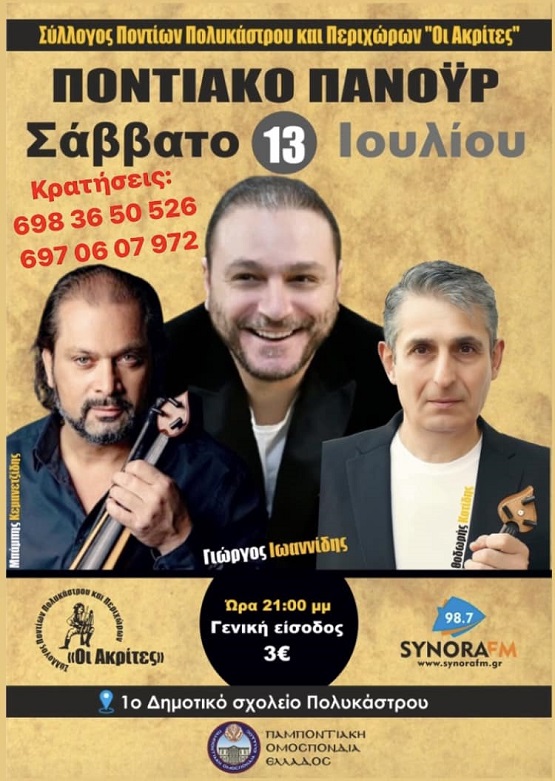 Ο Σύλλογος Ποντίων Πολυκάστρου και Περιχώρων «Οι Ακρίτες» διοργανώνει το Σάββατο 13 Ιουλίου 2024 και ώρα 21:00 την ετήσια θεσμική εκδήλωσή του «Ποντιακό Πανοΰρ».
