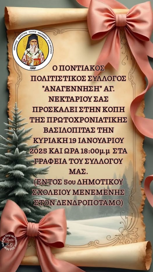 Με ανακοίνωσή του το διοικητικό συμβούλιο του Ποντιακού Πολιτιστικού Συλλόγου «Αναγέννηση» Αγίου Νεκταρίου (Δενδροποτάμου) την οποία εκ μέρους υπογράφουν η πρόεδρος Παναγιώτα Χατζή και ο γενικός γραμματέας Αθανάσιος Παπαγιάννης, προσκαλεί τα μέλη και τους φίλους του συλλόγου να παρευρεθούν στην κοπή της πρωτοχρονιάτικης βασιλόπιτας την Κυριακή 19 Ιανουαρίου 2025 και ώρα 18.00 μ.. στα γραφεία του συλλόγου, εντός του 5ου Δημοτικού Σχολείου Μενεμένης, στον Δενδροπόταμο Θεσσαλονίκης.