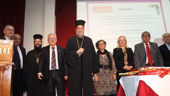 Στη συνέχεια, ο Σεβασμιότατος Μητροπολίτης Ν.Ι.Φ.Η.Χ.. κ. Γαβριήλ ευλόγησε τη Βασιλόπιτα του Συλλόγου, έκοψε το πρώτο κομμάτι της και κατόπιν ανάφερε, μεταξύ άλλων, πως: «Για μία ακόμη χρονιά είμαστε εδώ με τη Χάρη και την Ευλογία του Θεού, για να ευλογήσουμε τη νέα χρονιά, να προσευχηθούμε στον αρχηγό της ζωής και του θανάτου να δίδει υγεία, ευτυχία, όπως είπα, σε όλους σας. Και θέλω να ξεκινήσω, κ. Χριστοδούλου, εκφράζοντας θερμές ευχαριστίες για την πρόσκληση, αντευχόμενος προς όλους σας υγεία, δύναμη και συνεργασία για όλα όσα επ’ αγαθώ της πόλεως, της Ιστορίας του Μικρασιατικού Ελληνισμού, των Σπαρταλήδων και της τοπικής μας Ιστορίας πράττετε τα τελευταία 100 χρόνια. Θα ήθελα να ξεκινήσω, ενθυμούμενος και εγώ το πρόσωπο, το οποίο τόσο πολύ στιγμάτισε θετικά και την Ένωση Σπάρτης και όλη την περιοχή μας, τον αείμνηστο Χάρη Σαπουντζάκη, για τον οποίο και προσευχόμαστε, αλλά και ευχόμεθα να αναπαύει ο Θεός την ψυχή του, και εκεί κοντά στον Θεό, που είναι, να ξέρει ότι εμείς όλοι, είτε είμεθα Μικρασιπάτες είτε όχι, συνεχίζουμε το δικό του οραματικό έργο να προσφέρουμε στον Μικρασιατικό Ελληνισμό.