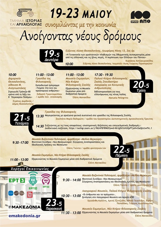 Για δεύτερη συνεχόμενη χρονιά, θα πραγματοποιηθεί η εβδομάδα εξωστρέφειας του Τμήματος Ιστορίας και Αρχαιολογίας του ΑΠΘ, υπό τον γενικό τίτλο «Ανοίγοντας Νέους Δρόμους – Συνομιλώντας με την Κοινωνία», από τη Δευτέρα 19 έως και την Παρασκευή 23 Μαΐου 2025.