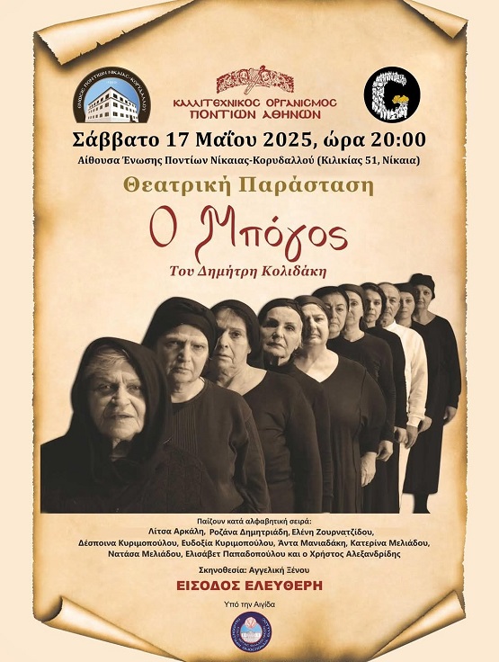 H θεατρική ομάδα του Καλλιτεχνικού Οργανισμού Ποντίων Αθηνών (Κ.Ο.Π.Α.) παρουσιάζει την θεατρική παράσταση «Ο Μπόγος» με θέμα την Γενοκτονία των Ελλήνων του Πόντου, το Σάββατο 17 Μαΐου 2025 και ώρα 20:00 στην αίθουσα της Ένωσης Ποντίων Νίκαιας - Κορυδαλλού (Κιλικίας 51, Νίκαια) με ελεύθερη είσοδο για το κοινό.
